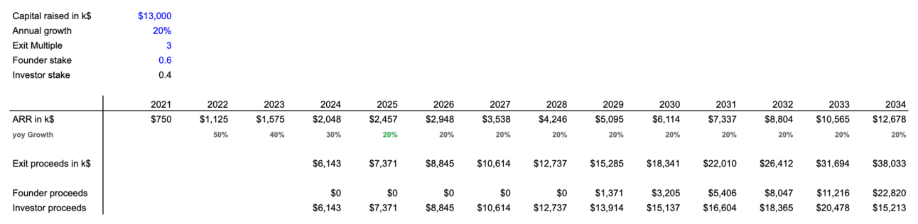 The problem: It's not going to get any better in the near future. See my example assuming 20% yoy, 1x liqpref and a 3x ARR exit multiple.
