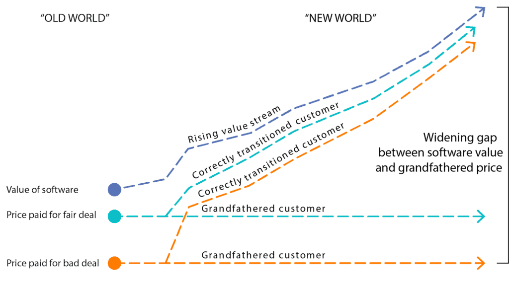 Allowing existing customers to maintain their original pricing / features hinders adoption of new, higher-priced offerings and prevents upsell opportunities.