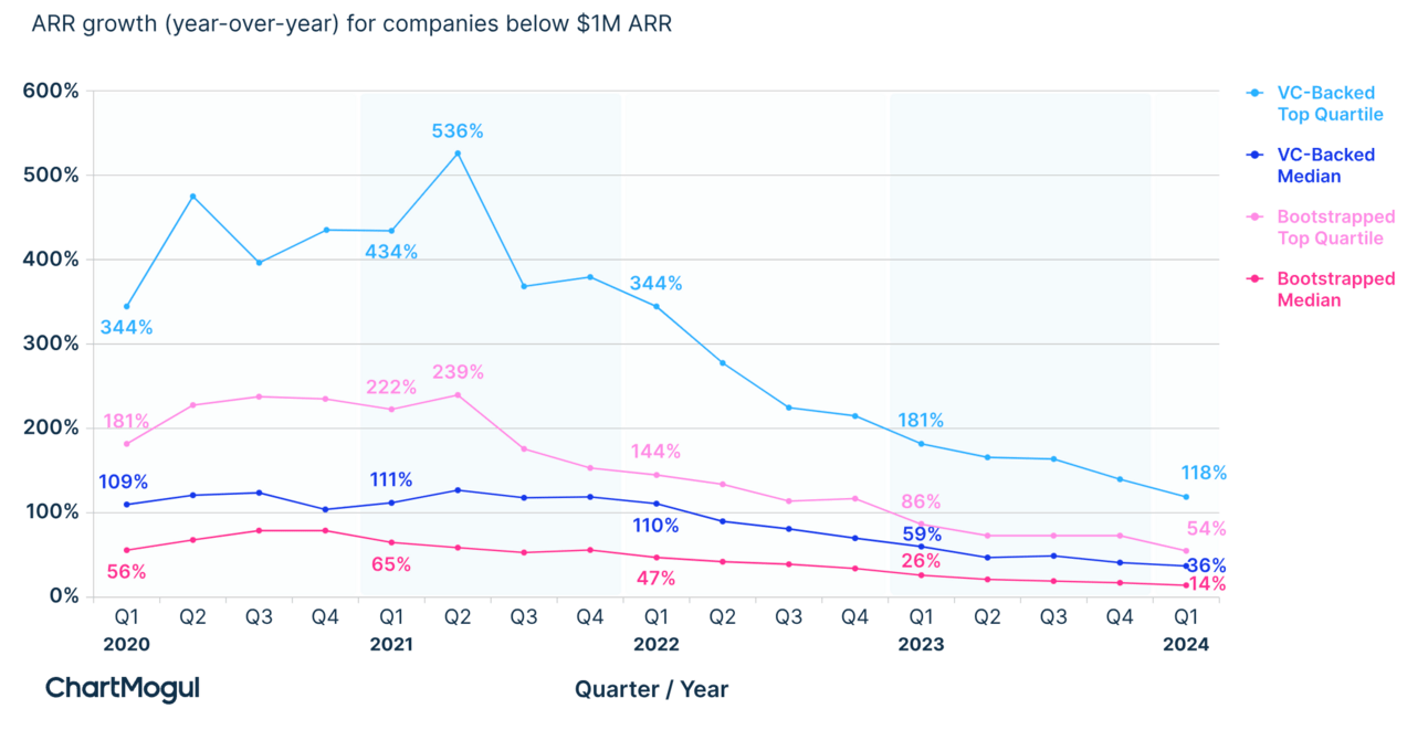The growth difference is smaller than in the early stages, but still significant. Bootstrappers who made it beyond the $1M ARR mark appear to be more resilient to market volatility than their VC-backed peers.