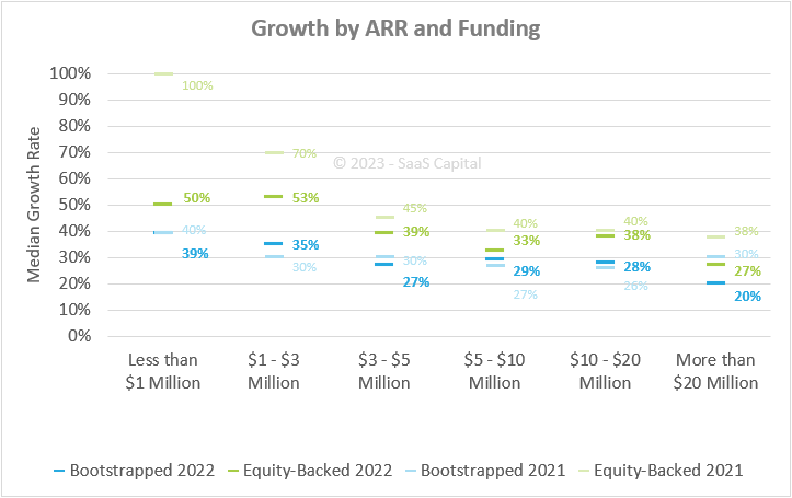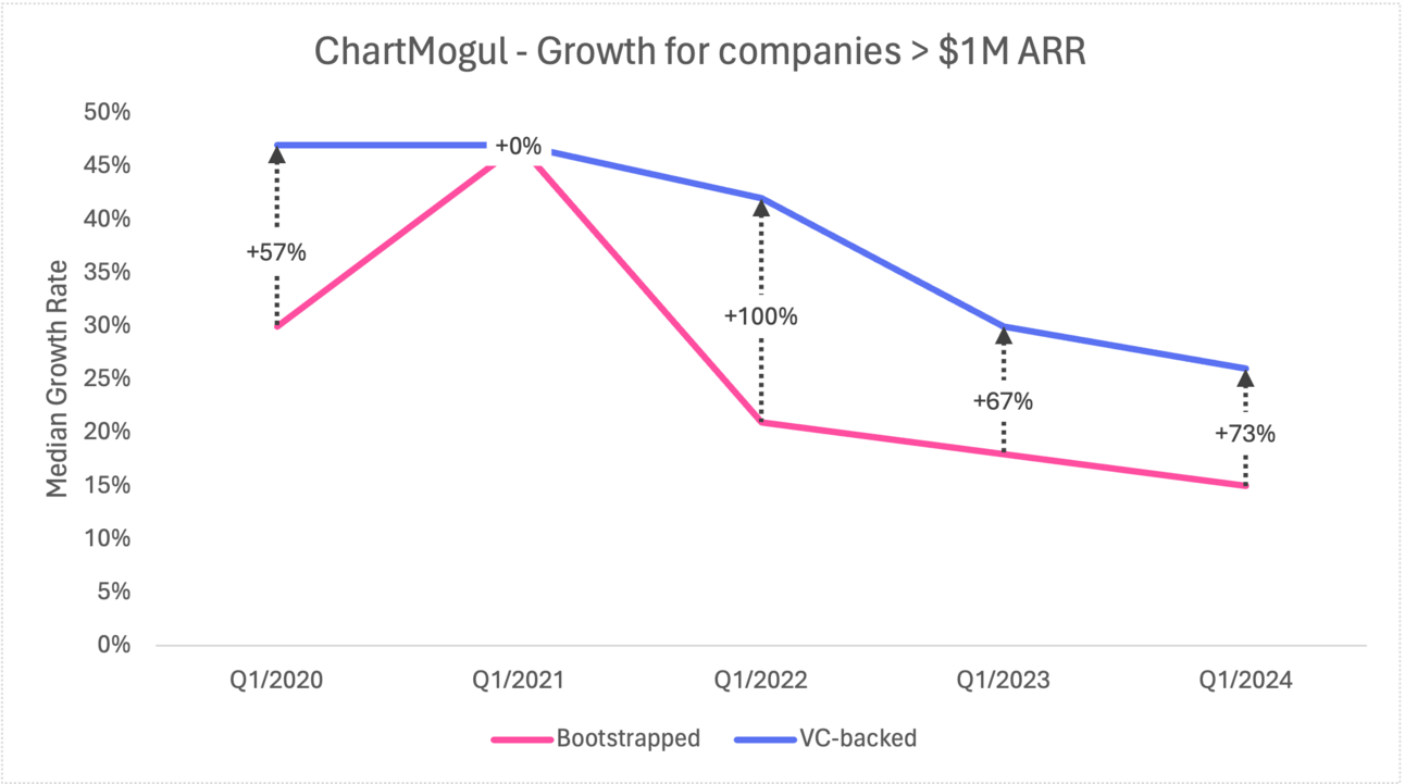 In 2022, small VC-backed startups apparently grew more than 100% faster than bootstrappers throughout the year (vs. +28% according to SaaS Capital).