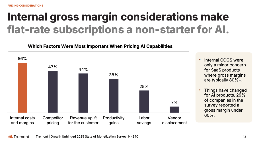 Tremont's data backs up what I'm seeing: 29% of companies who took their survey report gross margins below 60%. If you're struggling to cover costs of delivering AI capabilities with your current pricing, their report gives some inspiration on how to fix this.